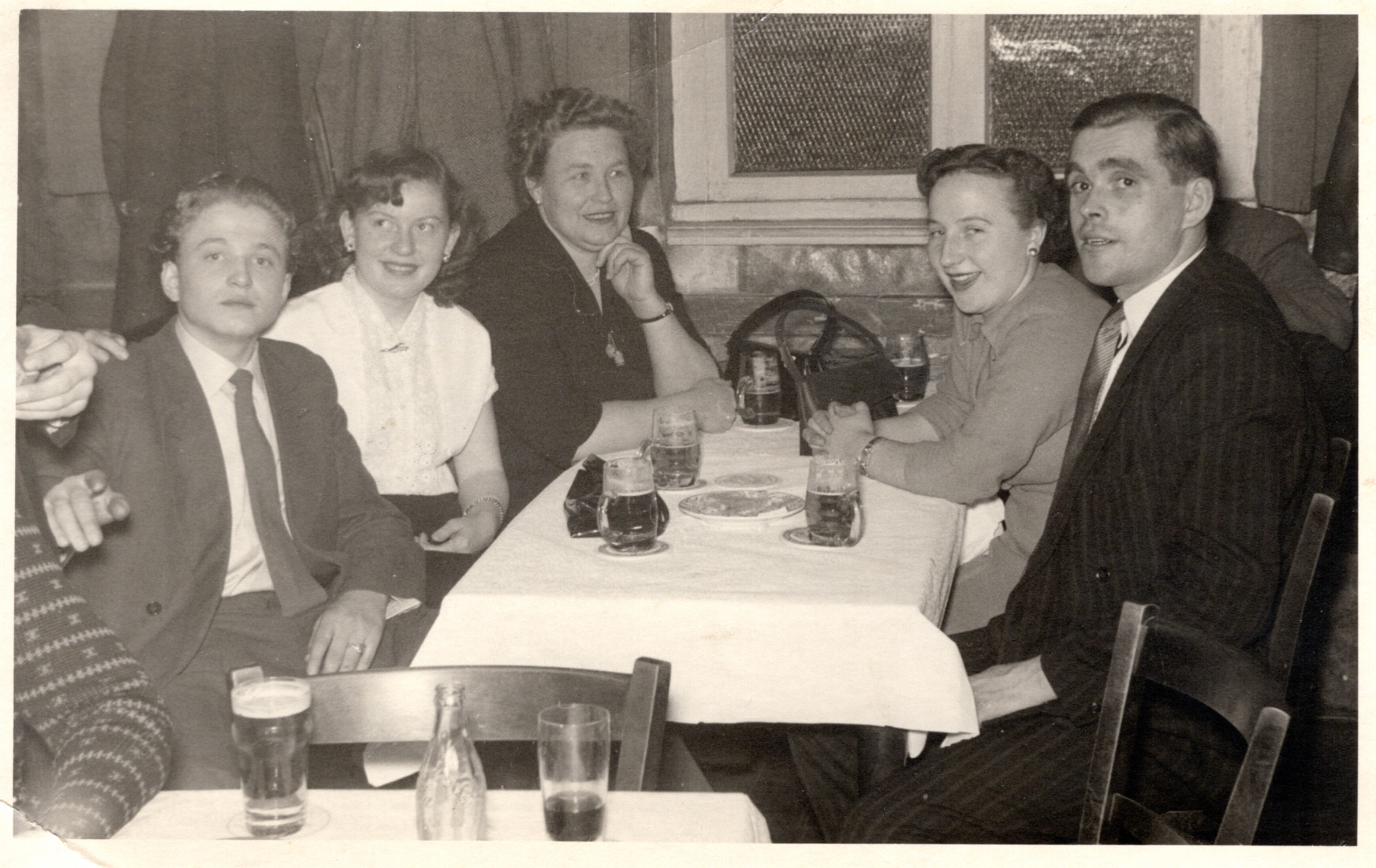 Meine Eltern (links) beim Schwoof, an der gleichen Tischseite hinten sitzt Oma Elisabeth (Personen rechts unbekannt)